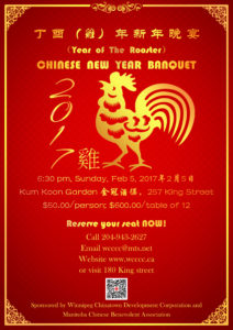 由温城华埠发展商会与曼省中国慈善协会主办,温城中华文化中心协办的温尼伯新年欢庆晚宴,即中国丁酉(鷄)年新年晚宴,将于2017年2月5日在金冠酒楼举办。作为每年必不可少的全城盛宴及温尼伯春节必不可少的一份精神文化大餐,各方各界知名人士将于此共贺中国新春!