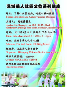 温城华人老年协会回馈社区,将由刘双博医生将会给大家带来公益养生讲座:“了解心血管疾病,呵护心脏的健康,”为大家讲解如何预防心血管疾病,欢迎您与家人朋友一起参加。讲座后还会提供面对面咨询及茶点。