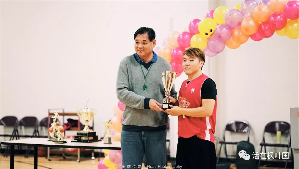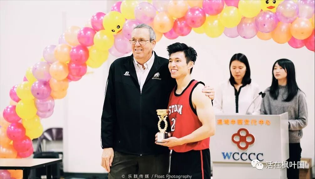 图:本届篮球赛的负责人刘先生为冠军加华队颁奖,队长张赛领奖