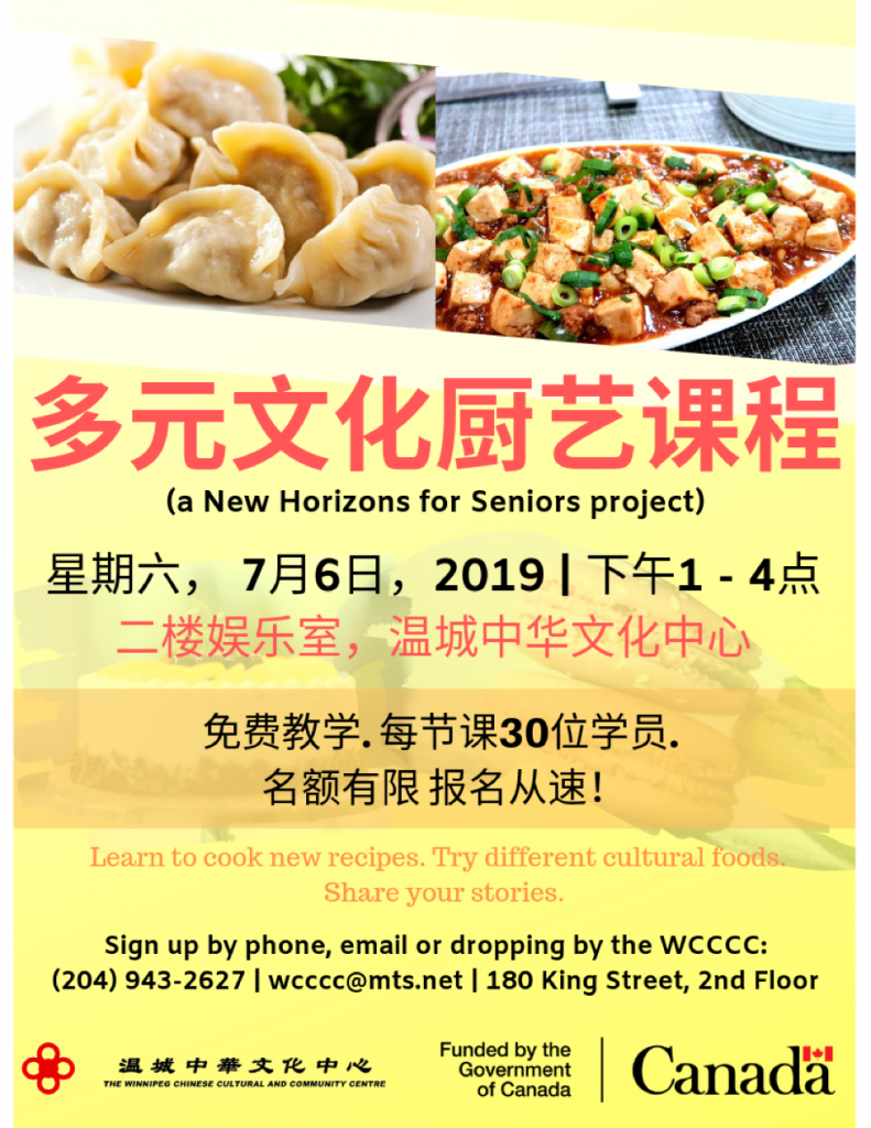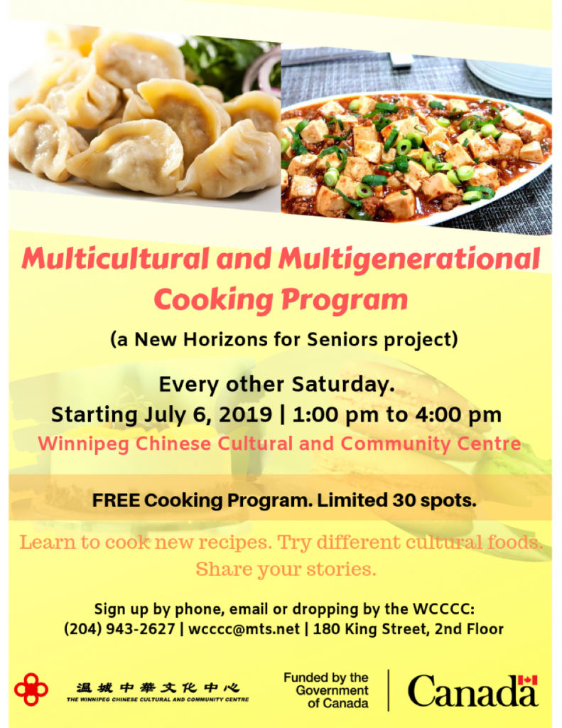 On Saturday, July 6, 2019, the Winnipeg Chinese Cultural and Community Center will be starting a cooking program to teach participants how to cook new dishes. This program is made possible with funding from the Government of Canada.
