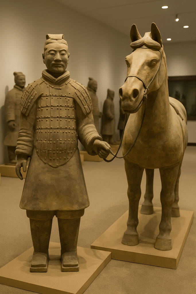 这是兵马俑的仿制品,由中华人民共和国国务院办公厅于2003年赠送,以庆祝温尼伯中华文化中心成立20周年。原始的兵马俑位于中国西安,由成千上万等身大小的陶制士兵、战马和战车组成,旨在为皇帝的来世提供守护。