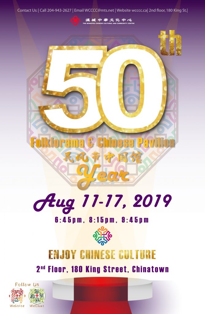 We are thrilled to participate in Folklorama’s 50th Anniversary! As one of the original eight Folklorama pavilions in 1970, the Chinese Pavilion enlivened the streets of Winnipeg’s historic Chinatown. Today, we welcome you inside Chinatown’s landmark Dynasty Building, home to the WCCCC. Our spectacular show and cultural display embraces the dynamism and diversity of Chinese culture. Join us and explore 50 years of Chinese Pavilion memories; try activities including Chinese calligraphy, mahjong, and Chinese chess. Taste Chinese cuisine, tea and Tsingtao beer. Following each stage show, the beautiful outdoor garden comes alive with performances such as the lion dance and martial arts shows. 欢迎 Welcome!